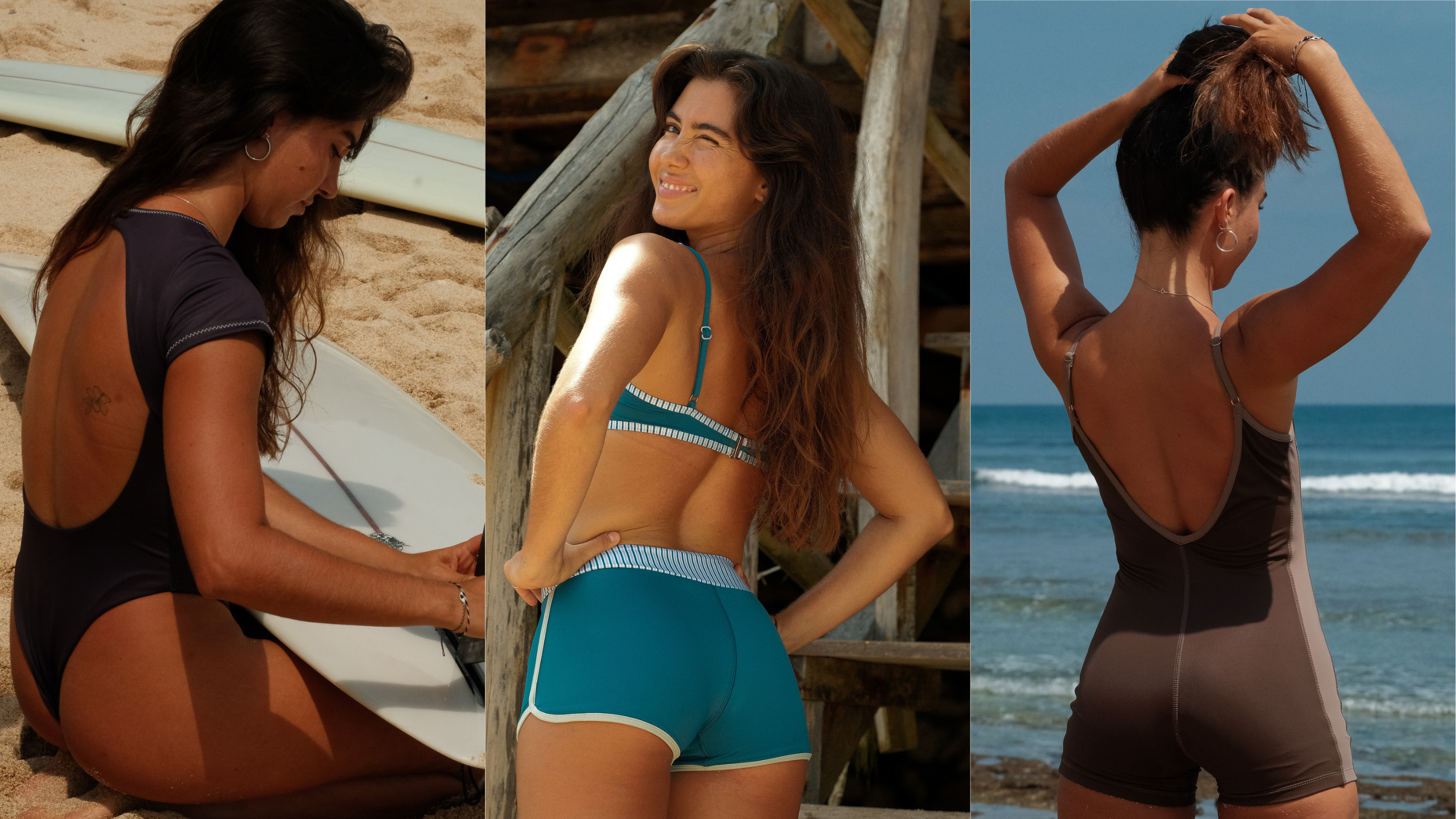 The Tropics Collection unfolds in three waves, each rooted in timeless earth tones of black, brown, and cream. Designed with performance, sustainability, and style in mind, this collection blends texture and print for the modern surf woman.
