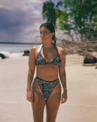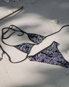 The Triangle Surf Bikini Top in Dark Tropics blends a classic surf silhouette with a bold new print. A hand-drawn floral design in espresso and white pops against a black base, outlined with espresso piping for a polished finish. Gold hardware adds a refined touch, elevating a top that moves seamlessly from tanning to surf sessions. Supportive, adjustable, and surf-ready, it’s as stylish as it is functional.