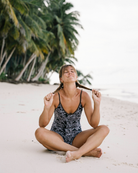 The Playsuit in Dark Tropics is built for days when you want strength and style in equal measure. The black base layered with hand-drawn florals in espresso and white gives it a moody, refined edge that stands out in the lineup. Compression fabric holds and sculpts, while gold hardware and a V back finish add subtle polish. Secure enough for heavy surf yet versatile enough for training, walks, or downtime, this one piece is all about confidence that carries beyond the waves.