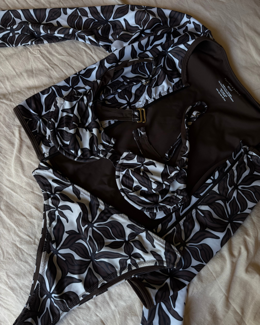 The Front Zip Rash Guard in Coconut Tropics is where surf function meets a feminine print. A crisp white base detailed with espresso and black florals is framed in espresso piping, giving the piece a refined finish. The cropped cut and long sleeves balance style with coverage, while the front zip lets you adjust for surf, sun, or a quick change on the beach.