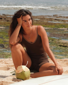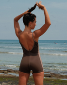 The Noserider Surf Playsuit x Alessia is the piece you’ll want on hand for every kind of beach day. The espresso base with latte piping and side stripes gives it a bold, retro feel, while the compression fabric hugs and supports in all the right places. Adjustable straps with silver hardware keep the fit polished and secure, whether you are paddling out, running down the beach, or grabbing a smoothie post-surf. It is just as easy to throw on for pilates or errands, making it a one piece you can truly live in.