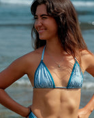 The Triangle Surf Bikini Top x Alessia channels a fresh take on a surf classic. The teal microstripe is playful yet refined, outlined in matching trim and finished with silver accents for a modern touch. Its adjustable design lets you customize the fit — cinch it close for sun, widen it out for surf. With a balance of style and function, it’s made to carry you from lineup to lounge with ease.